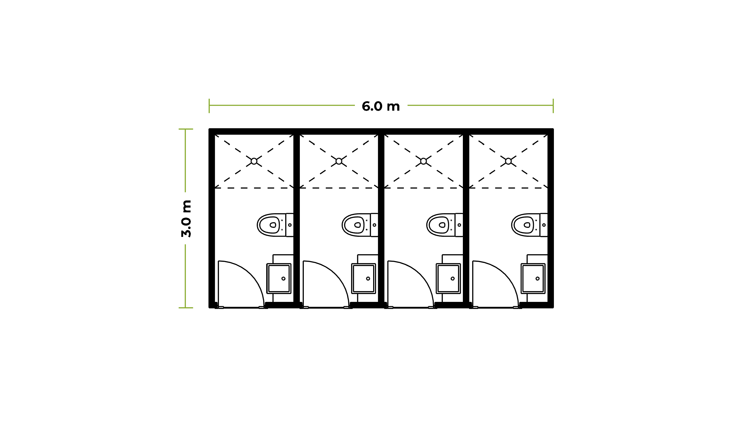 A medium size 18m² ablution block with 4 individual cubicles, for busy accommodation sites.
