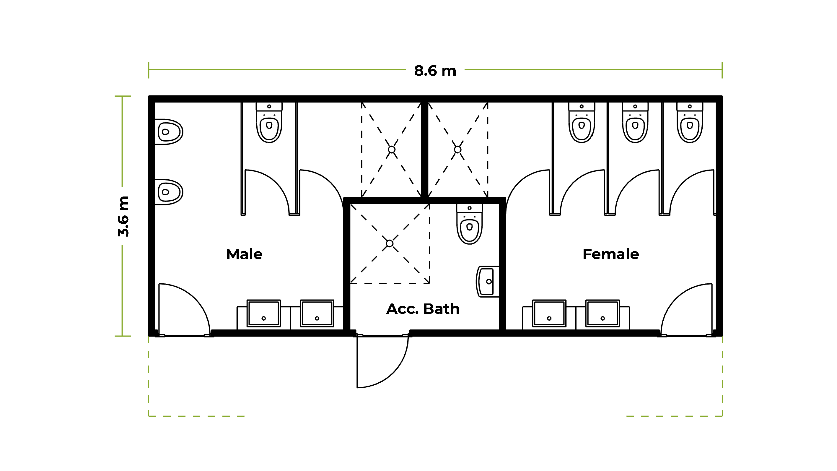 An efficient Male and Female toilet and shower facility that also includes an NZ4121:2001 compliant accessible bathroom. With commercial toilet partitioning walls and doors, and urinals in the men’s toilet, this facility is extremely functional.